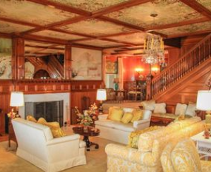 Grand staircase gives way to the central fireplace.