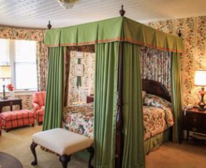 The home has been restored to its original charm, including this four-poster bedroom, with Victorian wallpaper